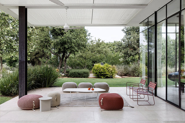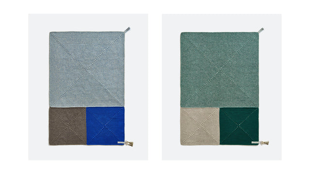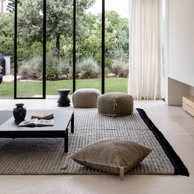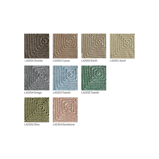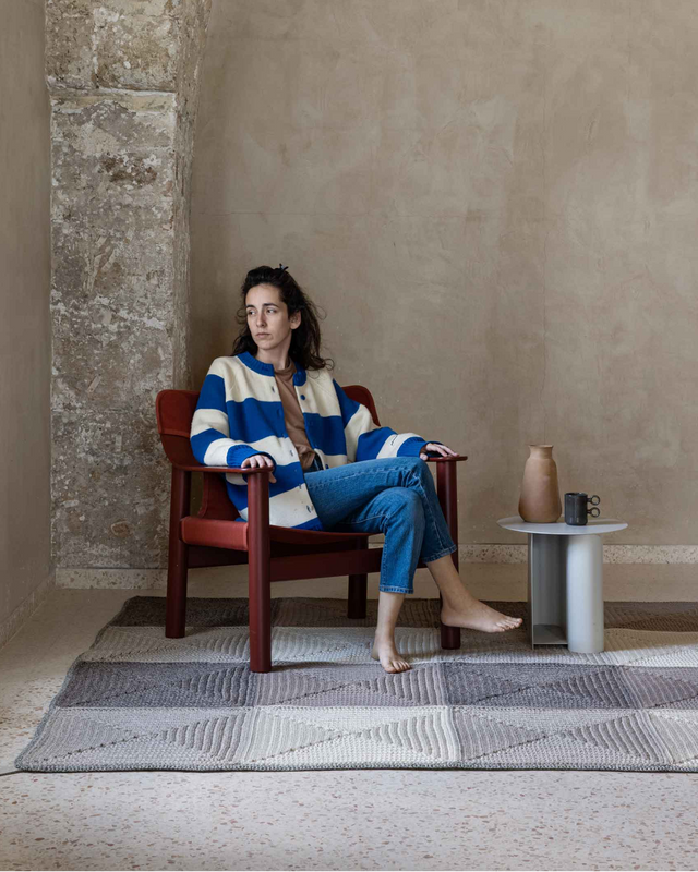 OUTDOOR - The indoor-outdoor collection explores the aesthetics of nomads and wandering and is suitable for indoor spaces as well as for outdoor. The granny square motif featured in the outdoor rugs is one of the most iconic elements of crochet craft. Like building blocks, these squares can be crocheted in any size and assembled into larger surfaces. Historically, they were often made from leftover yarn and crafted anywhere, becoming a uniquely nomadic element. Our outdoor rugs reimagine these classic granny squares in a new, contemporary way. Each rug is composed of multiple squares assembled together to form one large rectangle, framed with a border. The modular design allows for customization by size and color, offering a rug designed specifically for your space.