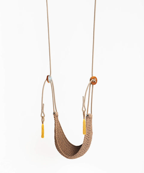 The IOTA Saddle Swings are lightweight and compact. They are good for enjoying the outdoors and kids love them too. You can easily take the hammock like swing with you to hang during camping trips. The swings are handmade from a signature yarn designed and produced exclusively by IOTA with UV protection therefore perfect for a sophisticated resort style look indoors or outdoors. The seat of the saddle swing is made entirely of crochet, which has a natural tendency to stretch. The seat can initially be a little tight and with use stretches and takes the shape of the body.