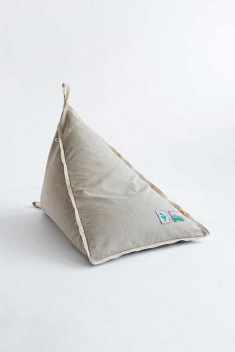 A triangular pouf for children, made of thick, high-quality fabric, with a hidden zipper for easy cover removal and washing. Comfortable for sitting and leaning back – but it’s more than just a seat.